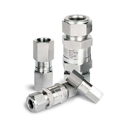 6 mm csőre ropp. rm. visszacsapó szelep, max 413 bar, 1/3 PSI (0,02 bar) nyitási nyomás (további választható nyitási nyomás értékek: 1, 5, 10, 25 PSI) FKM (Viton) O-gyűrű (választható opciók: NBR, EPDM, FFKM)